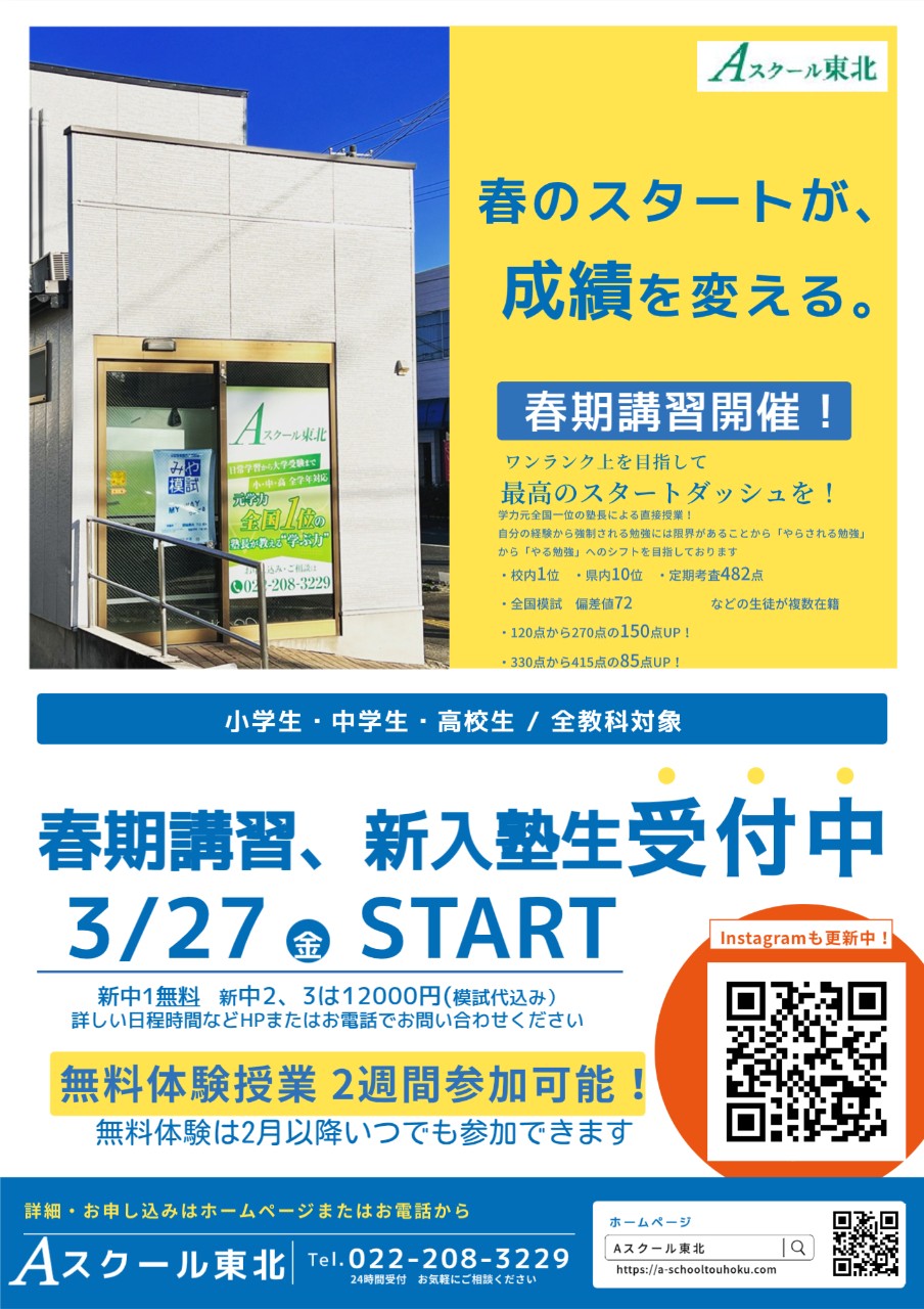 - <div>春期講習 受付開始しました!</div>3月27日より春期講習を開催いたします!<div>詳しい日程はこちらです</div><div><br></div><div>※日程は学校行事などにより多少変更がある場合があります</div><div><br></div><div>新中1 中学生準備講座 無料</div><div>ノートの取り方、授業の受け方のレクチャーと中学の先取り学習をいたします。</div><div><br></div><div>3月28日 14:00~16:30</div><div>3月31日 14:00~16:30</div><div>4月2日 14:00~16:30</div><div><br></div><div>新中2 復習及び中2の先取り学習</div><div><br></div><div>3月27日 14:00~17:00</div><div>3月29日 14:00~17:00</div><div>3月30日 14:00~17:00</div><div>4月4日 14:00~17:00</div><div>4月5日 宮城模試</div><div><br></div><div>新中3 復習及び中3の先取り学習</div><div><br></div><div>3月27日 17:30~20:30</div><div>3月28日 17:30~20:30 </div><div>3月30日 14:00~17:00</div><div>4月4日 17:30~20:30</div><div>4月5日 宮城模試</div><div><br></div><div>となっております。</div><div>また無料体験4回も実施しております。</div><div><br></div><div>席に限りがございますので、お早めにお問い合わせください</div><div><br></div><div>お気軽にお電話、または当ホームぺージのお問い合わせフォームより</div><div>お問合せ・ご相談お待ちしております!</div>
